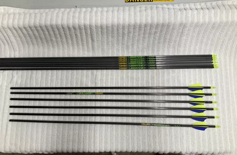 12 arrows, 300 spine - Six brand new uncut shafts, 6 fletched cut to 28 1/2” from carbon to carbon. These are in excellent shape as well. Can cut and fletch bare shafts if desired. Will trade for same arrow in 340 spine or sell.