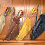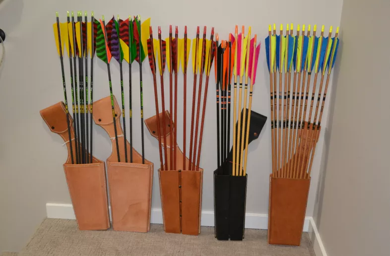 Custom leather made Traditional Archery gear for sale for the Recurve or Longbow Archery Enthusiast: Center back quivers, hip/belt quivers, pocket quivers, arm guards. Prices vary due to size and detail and my be negotiable. Center back quivers are made from Farmed Elk Hide or Deer Hide. The Black Center Quiver is made from Motorcycle Garment leather with a pebble texture. Curb side pick up preferred.
