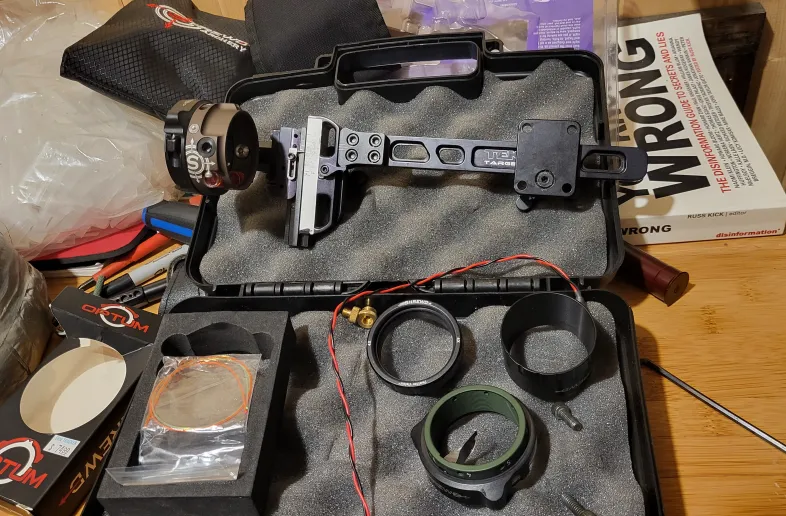CBE Tek target, 2 shrewd optum pin set ups (1 blue, 1 orange), shrewd sunshade, shrewd 4x lens, bag cover, case.