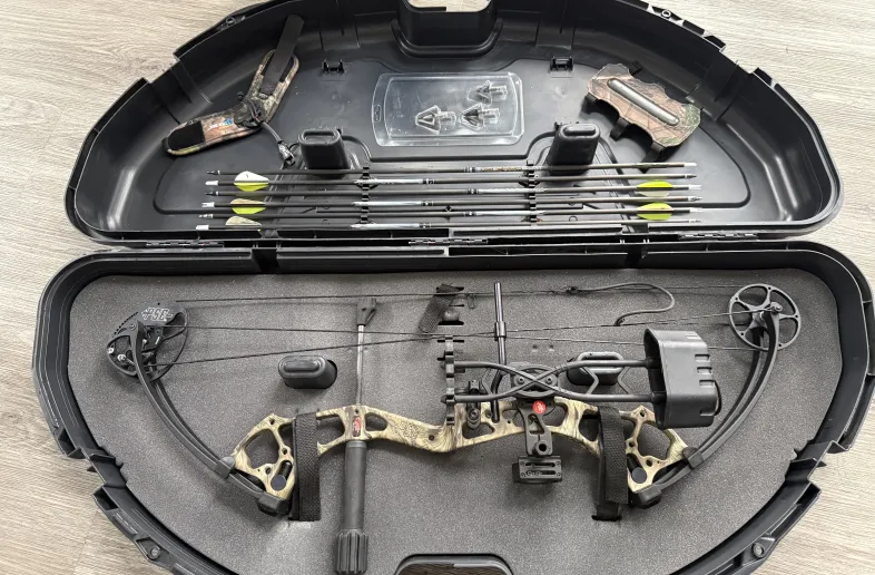 Like new condition. Only used for target practice. Comes with 6 arrows all with field points (a couple could use new fletches), 3 broad heads, a release, forearm guard, and the case. Bow is maxed out at 55lb draw weight and set at 30” draw.