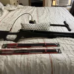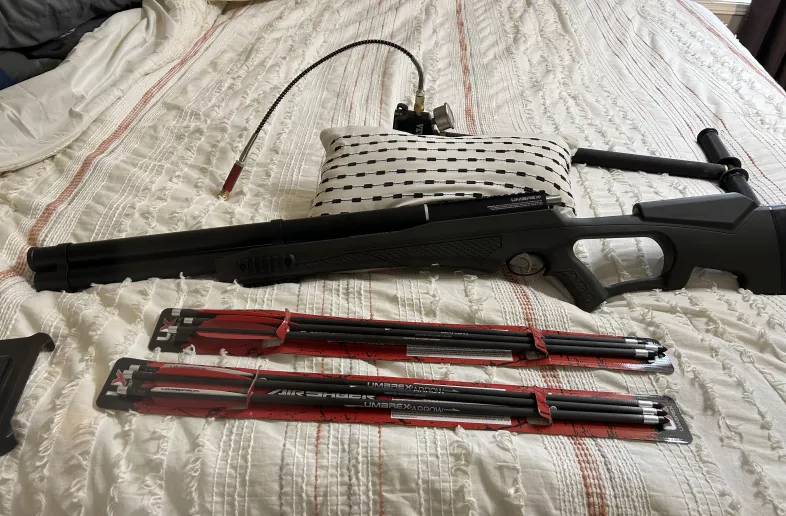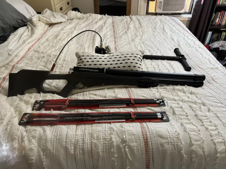 - Air sabre air bow comes with the pump extra arrows shoots 450 feet per second like new pump alone is over 300$ plus another 120$ in extra arrows