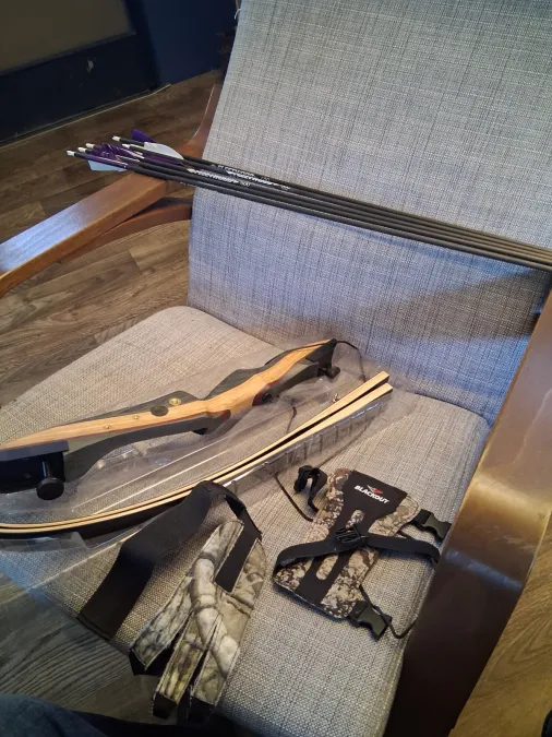 45lb lh bow. I only really used it 3 or 4 times. Comes with everything to start shooting. Finger guard, arm guard, 5 arrows the bow and a target. I think i still have the receipt.