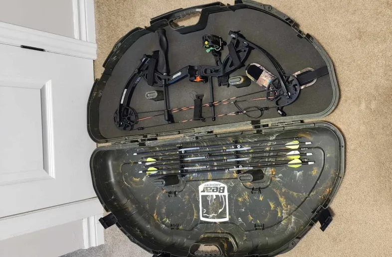 This is a Bear Cruzer G2 Bow with quiver, wrist release, arrows with field tips, broad heads, Hard Case and a field target.