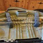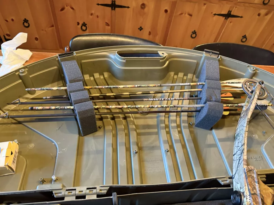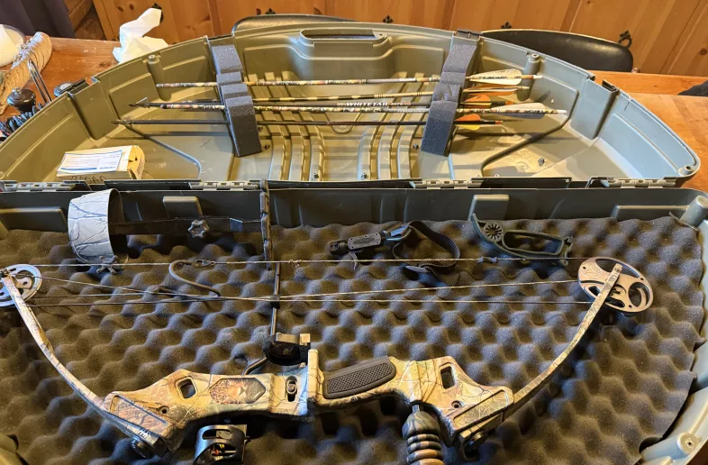 Compound hunting bow very lightly used. Includes hard case, 5 arrows with broad head and target tips, quiver, trigger and other accessories.(see pictures)