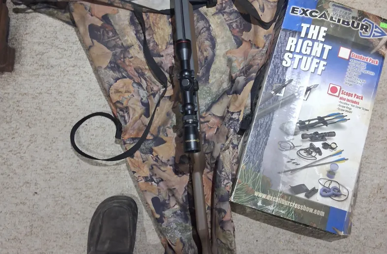 Excalibur Vixen model. Aimed in and used for 2 hunts, shot maybe 15 times. Been stored inside a cabinet indoors at all time since. Comes with scope, and $350.00 accessory kit pictured, spare pull string , parts ect, box says what else is included. Sad to sell but have not hunted since married and want it used for its purpose not stored away. Comes with camouflage carrying bag. $250.00. I have lowered my sell cost from $300.00 to$250.00 this is a low as I am willing to go so serious inquiries only please.
