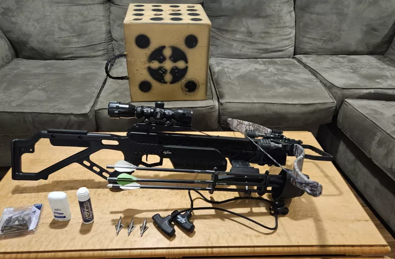 Comes with a few broadheads, 2 bolts, serving wax, rail oil, field points (125/150 grain) and a foam target. Very accurate, took a buck with it last season.