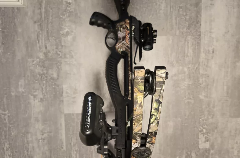 Comes with 3 bolts, draw cord and Barnett red-green dot sight. 150 LBS draw weight, 32 1/2" overall