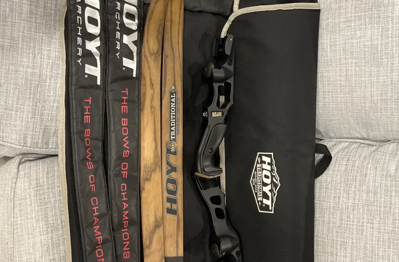 LH Hoyt Satori excellent condition. 19” black riser with 35lb medium maple limbs. Includes case, limb covers and stringing aid. Willing to sell riser and limbs separately.