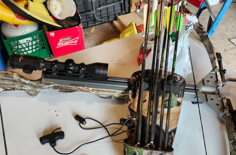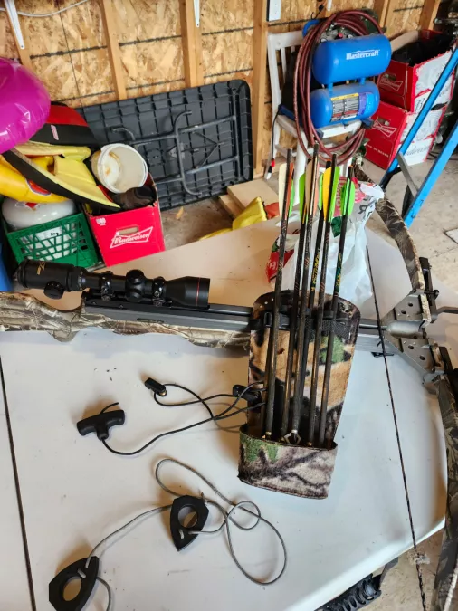 Excalibur crossbow with scope sling case 7 razor head arrows 5 practice arrows practice block and ground blind.