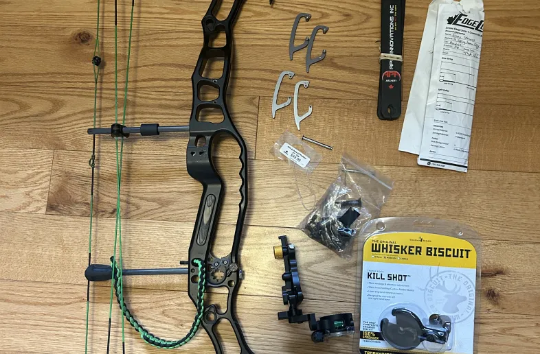I will include a Troohy Ridge single pin slider sight, as well as a Trophy Ridge Whisker biscuit rest.