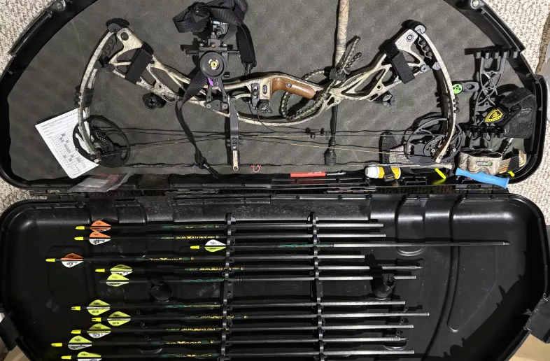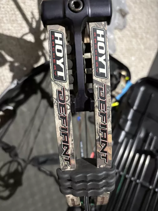 Hoyt defiant compound bow with Qad Hdx arrow rest. Comes with quiver, release, and a dozen arrows. With field tips and hard case.