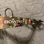 Bowtech Fuel with side quiver, wrist release, and 5 arrows (one detached fletching and one with fletching almost off).