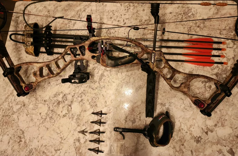 Includes Muzzy broadheads, carbon Easton arrows and field points, quiver, truglow 3 pin sight, drop away arrow rest, tru ball wrist release, stabilizer and wrist strap. Everything you need to get out and start hunting. Bow is in perfect condition. Will ship at buyer's expense or local pickup/meet up.
