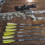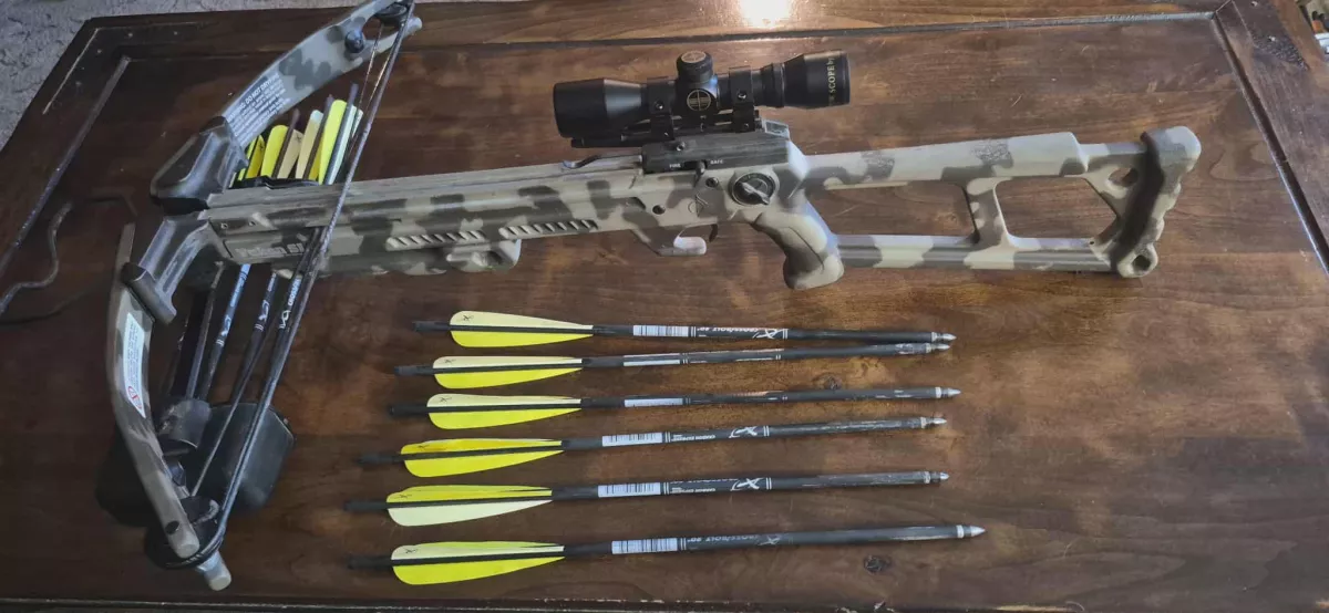 Yukon SL Crossbow, manufactured by Hortons Manufacture, Draw Weight 150 Lbs, camouflage design, shoots about 250 FPS, 32.4” in length, 25” wide, complete with 10 arrows & Barnett Crossbow Scope 4x32mm.