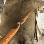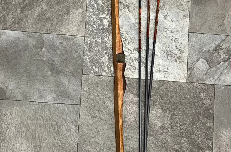 6ft long self bow made from red oak 55lb @29" Comes with 3 feathered arrows. No string included.
