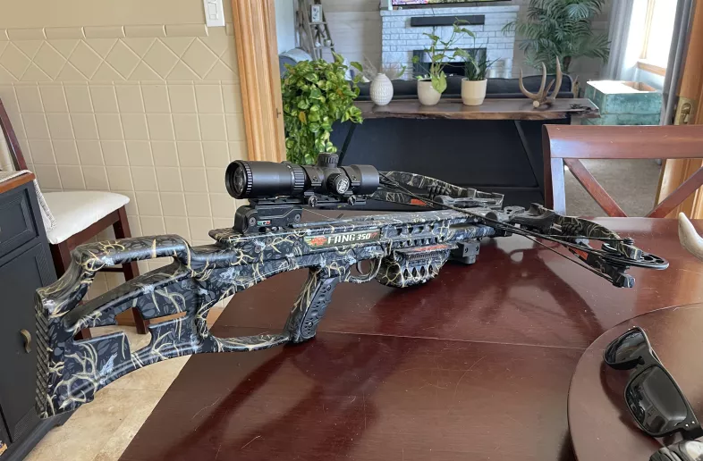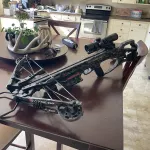 350 fps in a compact modern xbow, with an blue/red illuminated scope, rope cocker, 5 arrow quiver and some bolts