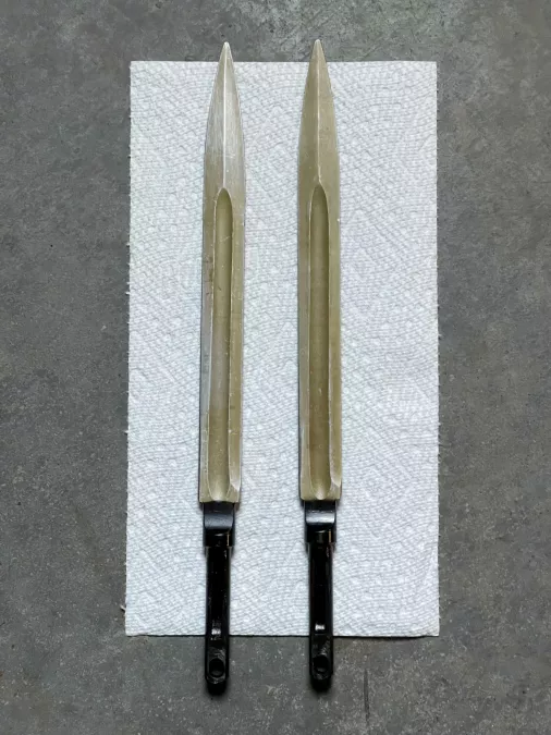 For sale are two matte “gold” coloured bayonets from non-refurbished Tula SKSs. $50 each, add $15 for shipping. Thank you.
