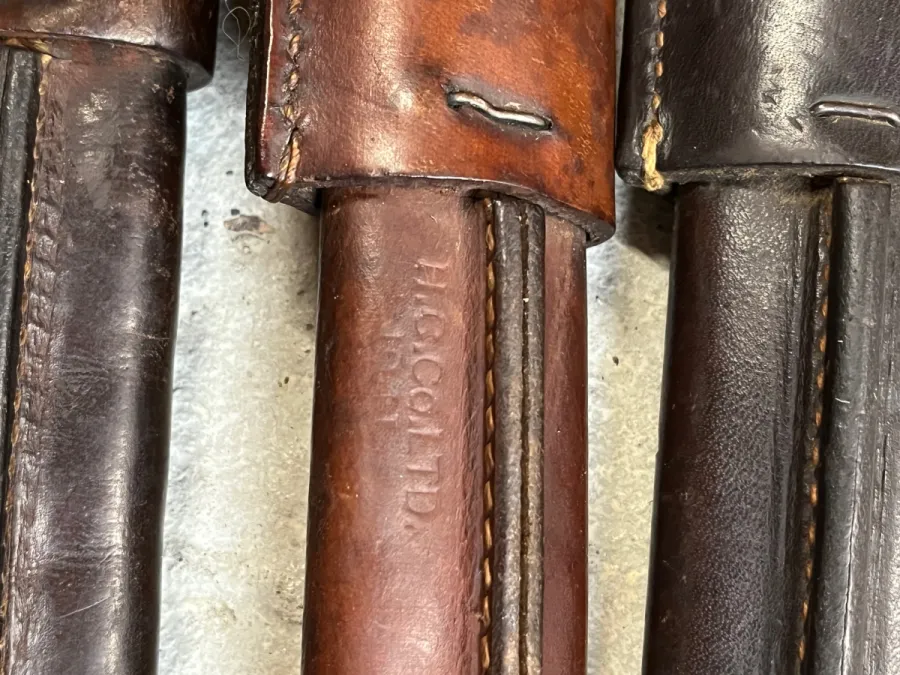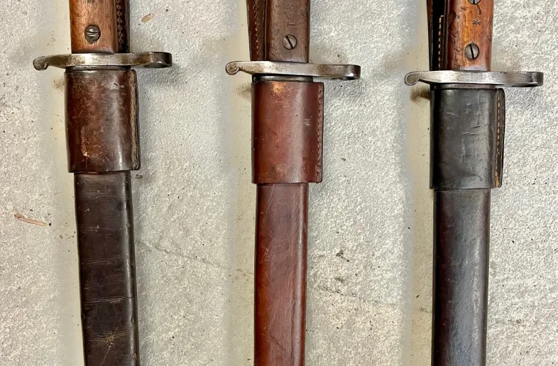 The MkII bayonet was modified to be more effective in combat by reshaping the end to penetrate better. These three samples have all been modified which indicates they likely saw service overseas during WW1. They are well marked as per pictures.