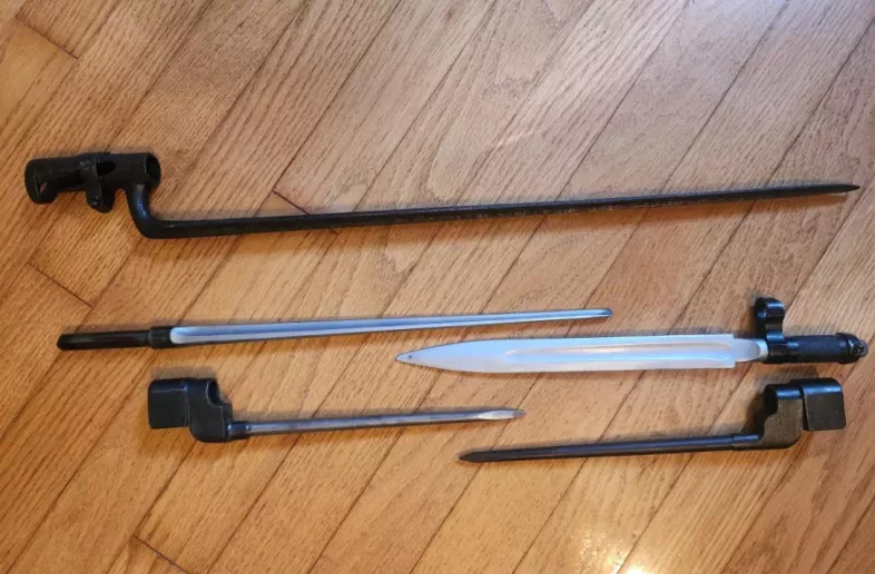 2 lee enfield no.4 bayonet , 1 russian sks bayonet , 1 SWISS MODEL 1869/1881 CRUCIFORM SOCKET BAYONET , 1 chinese sks bayonet . Open to offers