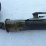 The bottom brass below the frog hook is pulled free from the leather scabbard.