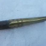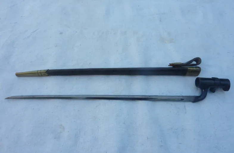 The blade has a slight downward curve to allow easier reloading while fixed to the muzzle-loading Enfield rifle. Measuring 44 cm (17 inches), it features a triangular cross-section with fullers on all three sides, tapering to a narrow, down-turned point.