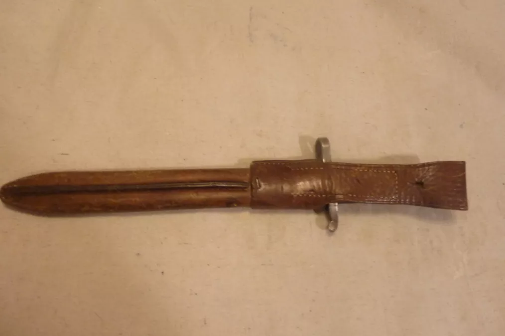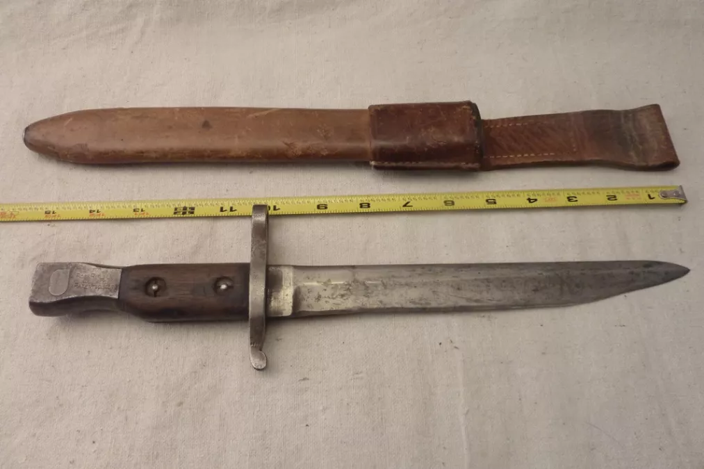 WW1 Canadian Ross Rifle Co MkII Bayonet dated 1916 with 1909 leather covered steel Scabbard and Frog
