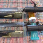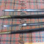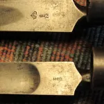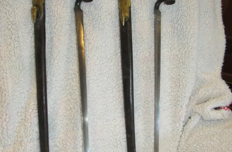 Two, of what appear to be,1853 British Pattern Enfield Triangular bayonets complete with their leather scabbards, non-matching. The bayonets look identical but the fullers are different and have slightly different crown markings, see photos. The one with WD marking also has 124 stamped on barrel band. Barrel openings are approx. 0.770” dia. Blades do have some surface pitting or discolouration. Musket barrel mount system is identical but one adjusted slightly differently. Both scabs. are marked broad arrow WD with serial nos. 82232 and 82244; one scabbard is missing two of its three rivets at the tip. Leather is flexible with no rot. Would prefer to sell both together as I no longer know which bayo goes with which scab. Asking $400 for the pair plus postage. Contact Pete via site mail system for further info or specific photos. Thanks for looking.