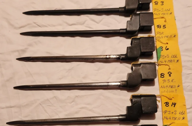B14 - No. 4 Mk II* Bayonet manufactured by Prince-Smith & Stells Co. P.S.&S.Ltd stamped and includes Great Britain’s Government acceptance mark on the left hand side. F.F. & S. Ltd. faintly stamped on right hand side (indicating the socket was forged by Fred Fisher & Sons Ltd.) Asking $40.00