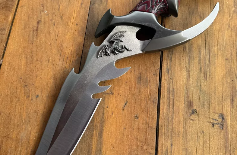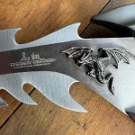 From manufacturer’s website: The Dragon Lord was built in remembrance of ancient dragons that once ruled the lands. Knife offers an ABS imitation Chinese carving stone handle with a relief carved dragon scale texture. The dragon-like curves of the cast metal guard, sub hilt, and pommel feature a steel gray chrome finish while the 8 1/2" 420 stainless steel blade is accentuated with dragon-wing curves and a cast winged dragon at the base of the blade. 14 1/4" overall. 8 1/2" blade.