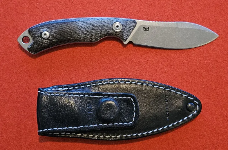 For sale, a MKM 'Pocket Tango' fixed blade EDC knife in very lightly used condition. This is an exceptionally well crafted every day carry fixed blade. The knife has a fantastic leather sheath with magnetic strap for pocket retention. Not only is the sheath well crafted but you can carry it on the left or the right, as the knife can sit either way in the sheath. Currently sells for $290 (about $330 after taxes and shipping)...not a cheap knife but you get excellent blade steel, a very flexible blade profile and great ergonomics. Price includes shipping in Canada.