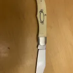 For Sale, Schrade Scrimshaw sc500 liner lock folder, vintage made in USA, Ram Scrimshaw scene, 4 inch blade. As new , never carried or sharpened. Tiny spilt at rivet as shown in photo, been there since I bought it long ago. No box. Will ship