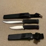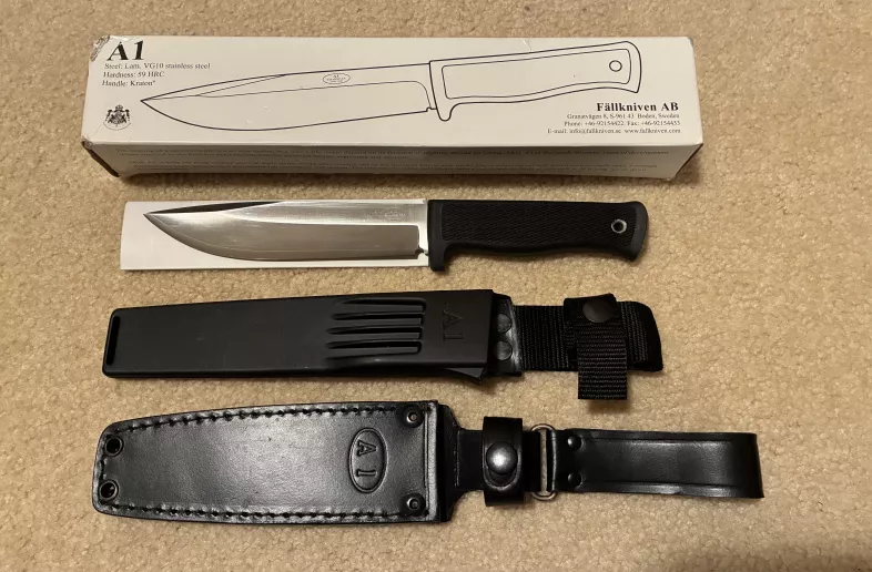 Brand new A1 Army Survival knife VG-10 steel. Comes with Zytel sheath and dangler leather sheath. Picture compares thickness to Swiss Army knife and Fallkniven F1 Pilot knife. Shipping at buyer’s expense or local pick up in Calgary, AB,