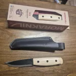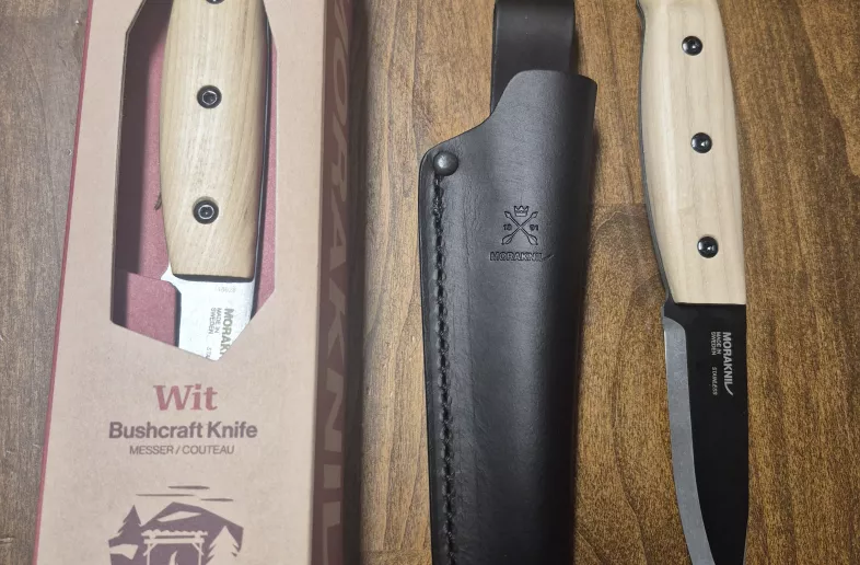 This is a brand new Morakniv Wit bushcraft knife, featuring a recycled Swedish stainless steel blade and an ash wood handle, perfect for outdoor adventures.