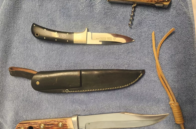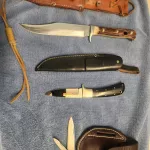 Puma Folder 942 two blades and corkscrew custom lined sheath light scratching on large blade on etched side. $300.00PRICE REDUCED