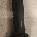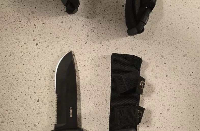 Heavy duty survival knife. This is the more expensive black version. Comes with 2 leg straps.