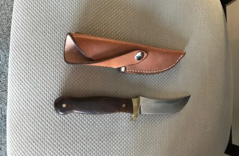 Hand crafted custom skinner made by Jerry Franz. D2 Rockwell steel; hand crafted wood handle with leather case. Brand new, never used. No trades. Call or text 780-293-4088. Willing to split shipping.
