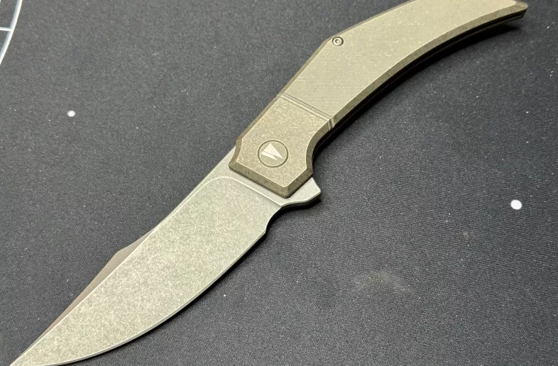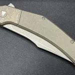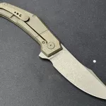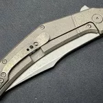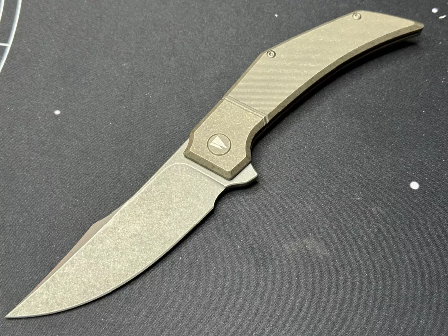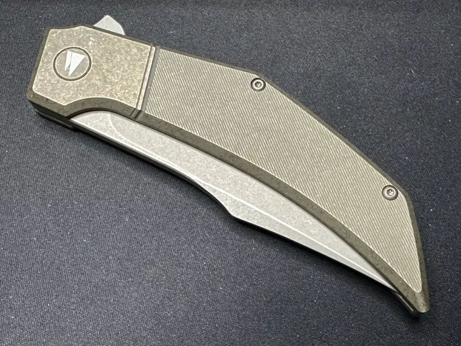 Up for sale is an amazing collaboration between Tashi Bharucha and Gudy van Poppel, sold under the brand name DBW from the Netherlands. I was hooked the moment I saw the blade profile. I've always been a fan of Tashi's work, and knowing his background, the Persian themed Xerxes design makes perfect sense. When I received the knife a few years back upon its initial release, I can proudly say that I wasn't disappointed at all! There are many incredible details that photos simply couldn't show, including the ergonomics and how the two handle slabs converges towards the tip of the blade when closed, making it very easy to notice if the blade is even slightly not centered - and of course there's none, it seats dead centered. The pivot runs on caged bearings and the action is very smooth. The flipper action is crisp thanks to the bearings and the well executed detent. It feels like a good 1911 trigger, not super light, but crisp and reliable every time. The blade and the titanium handle both feature an acid washed finish, giving the knife a subtle yet robust look.