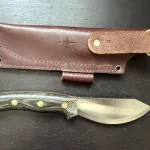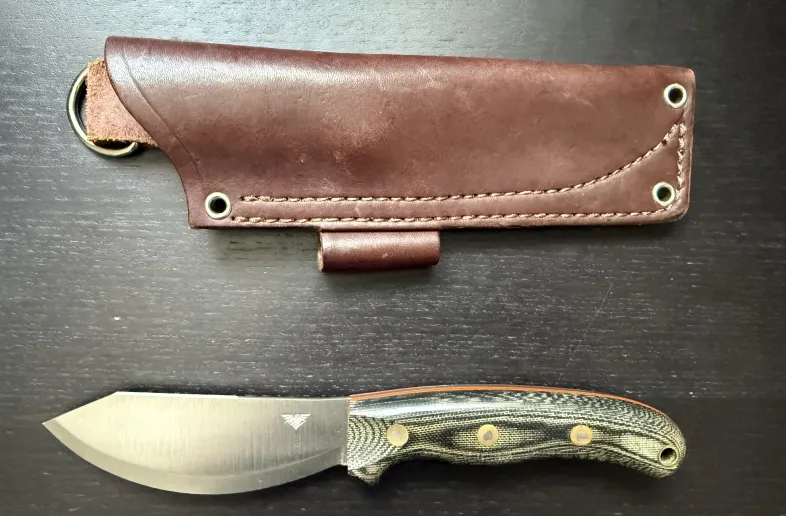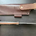 Brand new never used or sharpened. Black/green canvas micarta handle. CPM 3v blade and orange liners. Leather sheath with d ring. Can ship.
