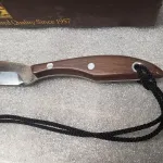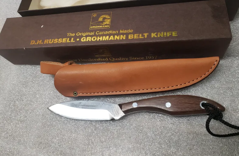 D.h.russell- Grohmann belt knife , these were produce for "canadian shooting sports" numbered 34 of 100 produced . Unused, as new in original box w all paperwork. 4" blade, 8 1/2" overall w rosewood handle. I believe these were produced in late 90s. Zoom in on pics for actual condition .