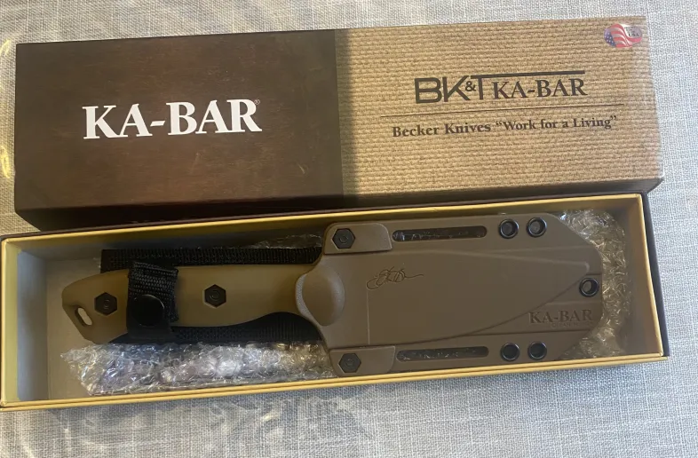 KA-BAR BECKER BK19 Knife Made in Olean, NY with German 1095 Cro-Van steel. Celcon sheath, and in burnt bronze color. Blade is 4.3 inches. Brand new and never used. $120