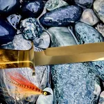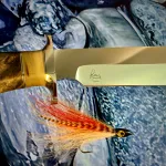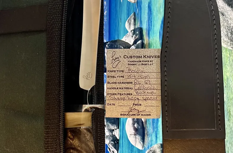 NEW ONE OF A KIND FIGHTER / BOWIE * BOB LAY CUSTOM KNIVES , AWARD WINNING WORLD-RE-KNOWN * AMERICAN GUILD MEMBER , 50YEAR CAREER ** BEAUTIFUL CALIFORNIA BUCK EYE HANDLE , 7 in" CPM 154 STEEL , HOLLOW GROUND ,MIRROR POLISH , STAINLESS STEEL GUARD & BUTT CAP , CALIFORNIA BIG HORN SHEEP SPACER, THIN LINE BLACK SPACERS , HAS QUALITY LEATHER , QUALITY LINED ZIPPERED CONDURA POUCH $900 emt NO TRADES