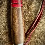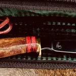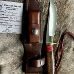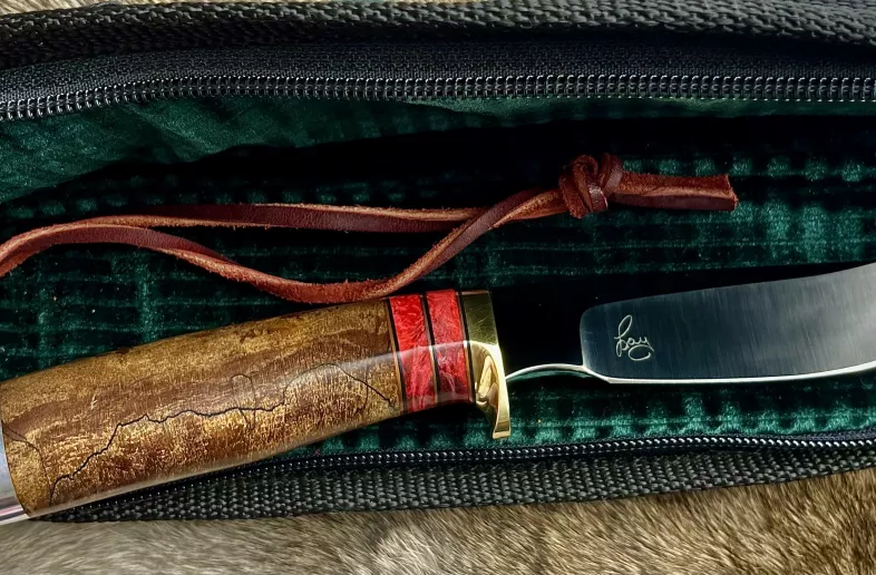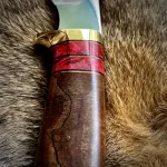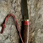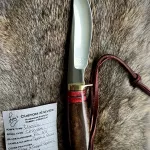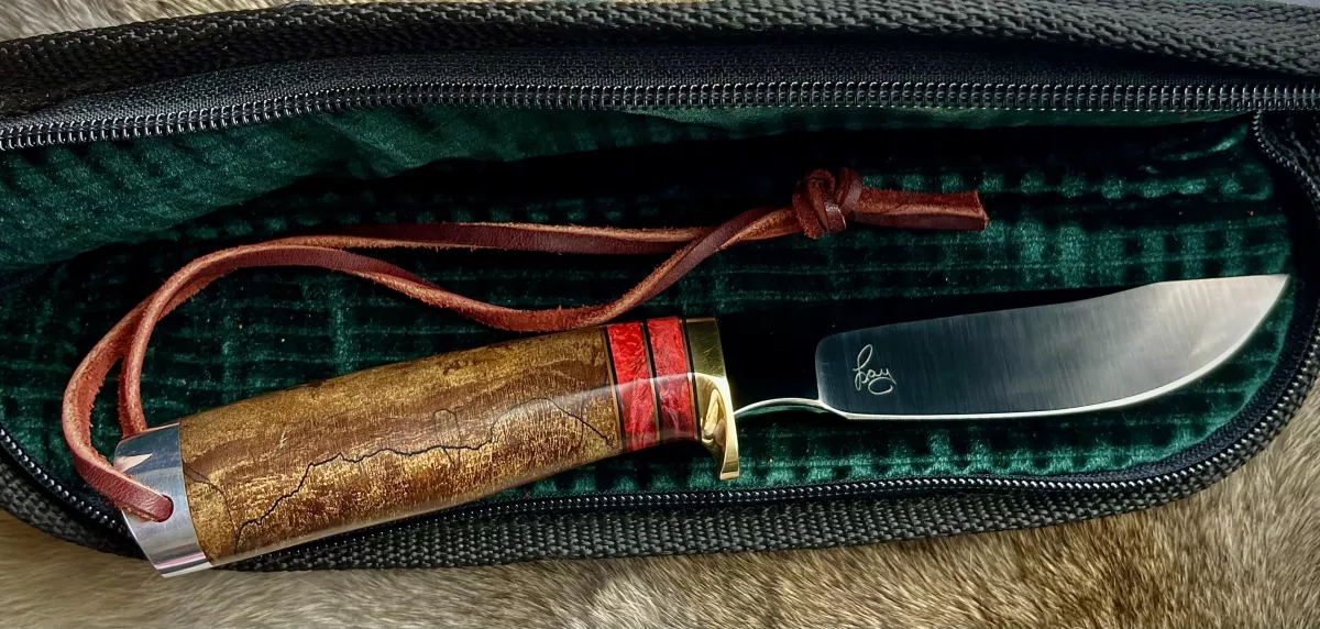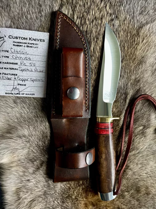 SOLD PENDING *** A MINT FULL PACKAGE COPPER CLASSIC , HAS A 5 INCH" 154 CPM STEEL BLADE , HOLLOW GROUND POLISHED FLATS , BEAUTIFUL SPALTED ALDER HANDLE , HAS BRASS GUARD WITH THIN LINE COPPER SPACERS & BEAUTIFUL DOUBLE RED BOX ELDER SPACER, STAINLESS BUTT CAP WITH THONG HOLE, QUALITY HAND MADE LEATHER SHEATH WITH SHARPENING STONE MADE BY JUDY LAY , HAS QUALITY HAND MADE CONDURA ZIPPERED POUCH