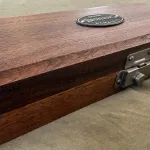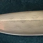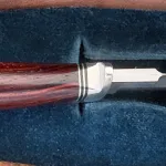 In 1983 Browning approached the Seki knife makers with an idea to make a one time limited edition damascus hunter based on one of Gil Hibben’s designs. Up to that time the making of a damascus blade involved the forge welding of iron and steel in alternating layers that often resulted in a costly and not very rust resistant final product. To meet Brownings requirement a new kind of damascus was created; not using iron, but stainless steel and nickel silver forge welded in 200 layers. The final result with it’s surface grain, beautiful pattern and high luster was such that Browning changed it’s plans and decided on extending the limited run designating it the Browning Model 3816. However only two models were produced over two years as the US Dollar to Yen exchange rate in 1986/87 made further production prohibitive. The knife was sold as the Model 3816 Browning Double Edged Damascus Hunter, with a mahagony handle and stainless steel guard and pommel, and a retail price of $350.00 in 1985. It came in a wooden lined presentation box, no sheath, and a certificate issued by Browning on Wa-shi (often called rice paper in the U.S.) and was serial numbered to 1000. Overall length was 7 1/2″ and the blade 3 5/8″. The Model 3816D was the same but with engraving on the guard.