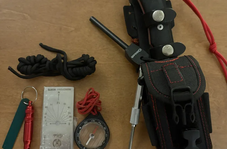 Awesome thick full tang 4116 stainless bushcraft/survival knife with the pictured items. Only lightly used a few times so there are tiny scuffs on the blade.