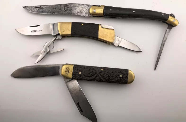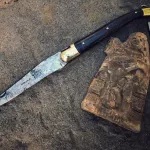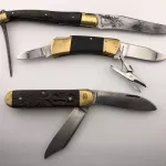 -Antique handmade slipjoint with forged blades and springs. Hand carved and engraved. Very solid built with thick blades no play.