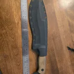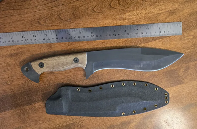 This Kukri by Mineral Mountain Hatchet works features a black blade with false top edge and full tang construction. The handle has brown canvas micarta scales. Kydex sheath.