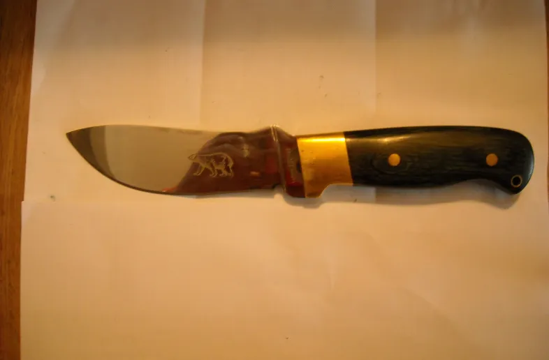 R. Olson custom knife polished to a mirror finish. Grizzly bear inscribed on the blade. 5 inch blade, 93/4 overall length