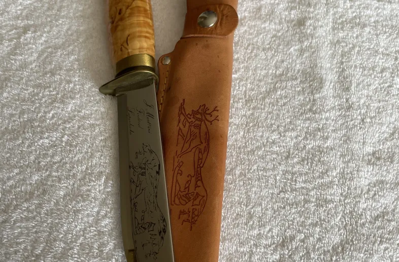 For Sale: This is a J. Marttiini Model 255 Lapinleuku fixed 6" blade knife with a beautiful stamped leather sheath. This knife is made in Finland and is in "very nice" condition. It has been sharpened. Asking $125.00 (does not include shipping)