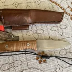 For Sale: This P Baker Handmade knife was made in England. It is a 4 inch blade in "very good" condition and feels very comfortable in your hand. It has a leather sheath and an attached "Light My Fire" fire starter. It has been sharpened. Asking $275.00 (does not include shipping)