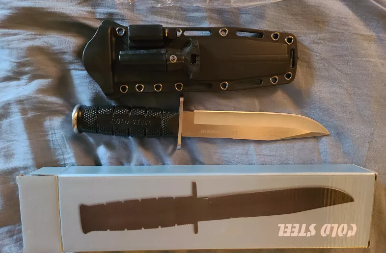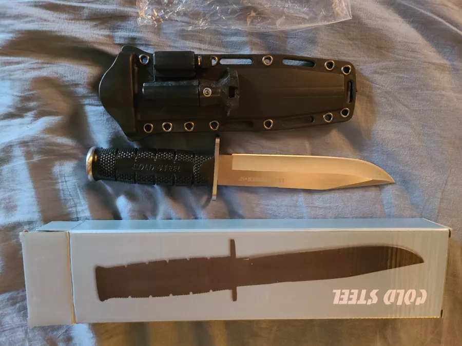 Nib , blade is 7 inches, rubber handle is 4.5 inches, little over 12 inches with sheath. Polymer sheath comes fitted with a fire start striker stick and tiny led flashlight as seen in pictures. Comes in box, has belt clip or use the utility holes all over sheath to tie it on how you like.